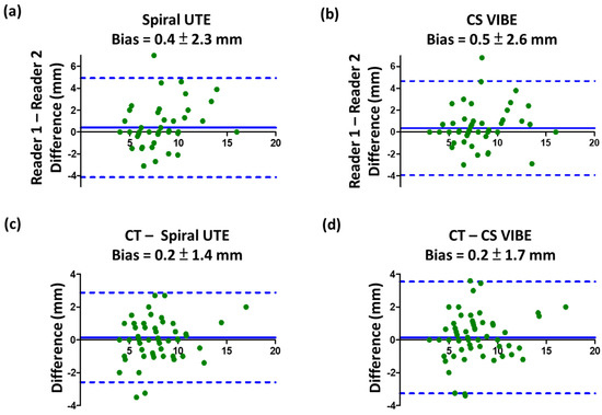 Bland–Altman plots depicting reliability and agreement of CT and MRI nodule measurements. Inter-reader reliability for the nodule diameter measurements showed a small inter-reader bias of less than 0.5 mm for (a) spiral UTE and (b) CS-VIBE. MRI modalities by (c) spiral UTE and (d) CS-VIBE images minimally underestimated the nodule size by 0.2 mm, compared to the reference CT. Abbreviations: MR: magnetic resonance; VIBE: volumetric interpolated breath-hold examination; CS: compressed sensing.