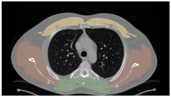 Sarcopenia was semiautomatically assessed by CT-based parameters measured at the level of the fifth thoracic vertebra by excluding fatty-infiltration using a CT-attenuation threshold of −29 to 150 Hounsfield units (HU). According to the literature [23], sarcopenia was defined as less than the sex-matched 33rd percentile of the respective muscle area: cross-sectional total paraspinal area (TPA), total rotator-cuff area (TRA), and total pectoral area (TPeA). Total muscle area (TMA) was defined as the sum of the former three measurements (Figure 1).