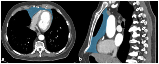 - Chen, O.; Sharma, A.; Ahmad, I.; Bourji, N.; Nestoiter, K.; Hua, P.; Hua, B.; Ivanov, A.; Yossef, J.; Klem, I.; et al. Correlation between pericardial, mediastinal, and intrathoracic fat volumes with the presence and severity of coronary artery disease, metabolic syndrome, and cardiac risk factors. Eur. Hear. J.—Cardiovasc. Imaging 2014, 16, 37–46. [Google Scholar] [CrossRef]