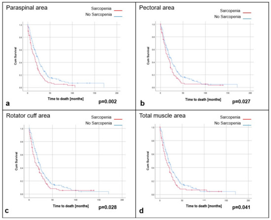 Kaplan-Meier statistics for surgically treated PM-patients with or without sarcopenia, defined as the sex-related 33rd percentile of the (a) paraspinal area, (b) pectoral area, (c) rotator cuff area, and (d) total muscle area at the 5th thoracic vertebra.