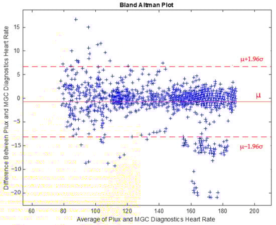 Bland Altman Bland–Altman Plot indicating mean difference in HR detection between the PluxECG and the lab-based 12-lead ECG system measurement. Mean bias and Limits of Agreement (LOA) (95% LoA) are shown.