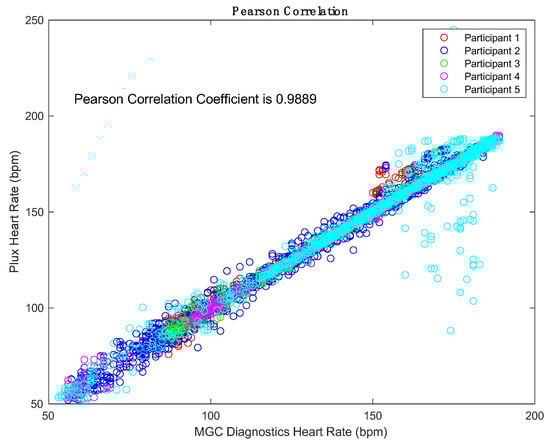 Pearson Correlation comparing PluxECG and the lab-based 12-lead ECG system heart rate measurement for the Ramp Protocol.