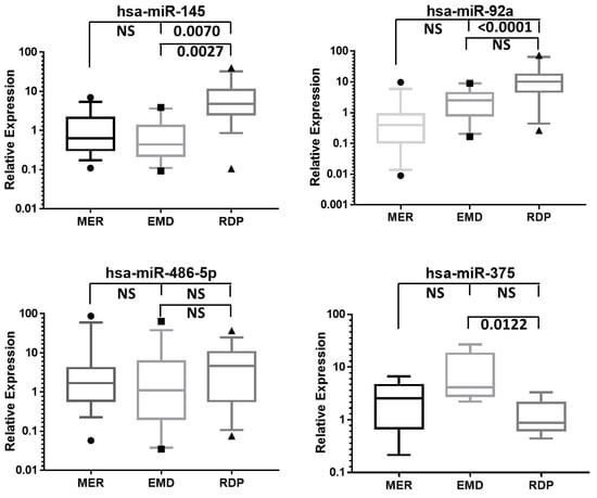We conducted a literature review focused on those miRNAs showing differential expression in the TLDAs analysis. Based on the previous evidence reported, four miRNAs in the serum, hsa-miR-145, hsa-miR-92a-3p, hsa-miR-486-5p, and hsa-miR-375-3p, and two in the vitreous samples, hsa-miR-223-5p and hsa-miR-212-3p, were selected for further validation through qPCR. Validation assays were carried out in all the individuals from each study group. The analysis of the four miRNAs in the serum validated the differential expression in three of them, hsa-miR-375-3p, hsa-miR-92a-3p, and hsa-miR-145, between the study groups. Further analysis revealed significant differences between all the possible pairs of groups (Figure 2).