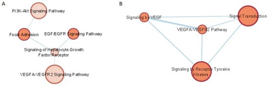 The target genes of the three validated miRNAs were obtained using the miRNet database; a total of 1326 targets were recognized. These genes were used as input for functional enrichment analysis in gProfiler for searching in the KEGG, Reactome, and Wikipathways databases. Afterward, the pathways’ interaction networks were built using the Enrichment Map app for Cytoscape. Reactome and Wikipathways revealed enrichment of the VEGF-related pathways and the closest interacting pathways were also identified (Figure 3). The focal adhesion pathway also showed enrichment in two databases, Wikipathways and KEGG.