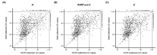 Comparison of Ct values for three SARS-CoV-2 genes detected in 1039 self- and HCW-collected samples that were positive for SARS-CoV-2. (A) N, (B) RdRP and S, and (C) E. The dotted lines between the x- and y-axis of the scatterplot indicate the reference Ct values of 20, 30, or 40. Each sample was tested using real-time PCR under the indicated conditions.