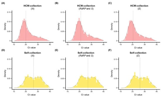 Histograms showing the distribution of Ct values for concordant positive specimens (n = 850). (A–C) Density of (A) N, (B) RdRP and S, and (C) E in the HCW-collection group. (D–F) Density of (D) N, (E) RdRP and S, and (F) E in the self-collection group. The y-axis of the histograms represents the estimation of the probability density estimation, whereas the vertical line presents the mean values.