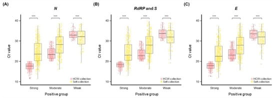 We analyzed and compared the Ct values of self-collected and HCW-collected samples. The Ct values were as follows: strongly positive (median 17.7–18.3 for HCW-collection versus 22.5–23.6 for self-collection), moderately positive (median 22.7–23.3 for HCW-collection versus 27.9–28.2 for self-collection), and weakly positive (median 32.9–33.7 for HCW-collection versus 31.9–32.1 for self-collection) (Figure 3). Compared with self-collected samples, the HCW-collected samples had a lower Ct value for strongly and moderately positive samples. In contrast, the HCW-collected samples had a higher Ct value for weakly positive samples. All groups (strongly, moderately, and weakly positive) of Ct values differed significantly between HCW- and self-collected samples (paired t-test; p < 0.001).