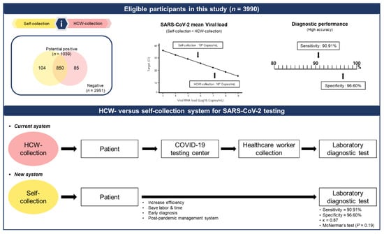 This study was designed as a collaboration between Ewha Womans University and Seegene Medical Foundation for the Ewha Safe Campus (ESC) project. This project was developed by the university safety campus management as a model for the SARS-CoV-2 infection. The study was approved by the Institutional Review Board of the Seegene Medical Foundation (SMF-IRB-2022-022). Informed consent from the participants was waived because the data collected for this study were anonymized. Anonymized data were obtained from the ESC project between February and April 2022. A total of 16,478 participants were enrolled in the study and divided into two groups: (i) both self-collection and HCW-collection (3990 participants), and (ii) either self-collection or HCW-collection (12,488 participants). Participants from the latter group were excluded from this study. The participants were provided visual instructions according to the self-collection manual (Korean version). Self-collection was first conducted under the supervision of HCWs, and HCW-collection was conducted immediately thereafter. Self-collection was performed by first swabbing the anterior nares and then the mouth, whereas HCW-collection was performed by swabbing the oropharynx first and then the posterior nasopharynx. Each sample was analyzed immediately after collection. The outcomes of the test using self-collected samples were compared with those of the HCW-collected samples.