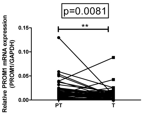 Figure 2. Comparative expression of PROM1 mRNA in paired tumor and peritumor mucosa. Data are presented as relative mRNA expression of target gene to GAPDH. Wilcoxon matched pairs signed rank test, p < 0.0001. ** The difference between the matched pairs is statistical significant.