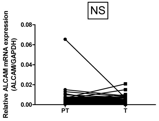 The expression of total CD166 (ALCAM) was assessed in paired samples of CRC tumors and adjacent tissue. The total CD166 expression was increased in tumor tissue, compared with paired non-invaded peritumor samples in 13.73%; in 13.73%, the expression was higher in non-malignant peritumor tissue, and in the remaining 72.55% the difference between paired samples was biologically insignificant (Figure 3).