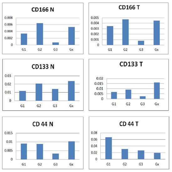 Comparing CD166 vs CD133 vs CD44 expression patterns with the tumor grading (Figure 6), we observed the lowest levels of all three markers in normal tissue, grade G3, similarly in the case of CD166 and CD133 tumor tissue. When comparing normal vs tumor tissue for each marker, the highest expression of CD166 was related to G2 and the lowest to G3, while CD133 was associated with Gx. The only observation related to CD44 is the decreasing expression values from G1 to Gx.