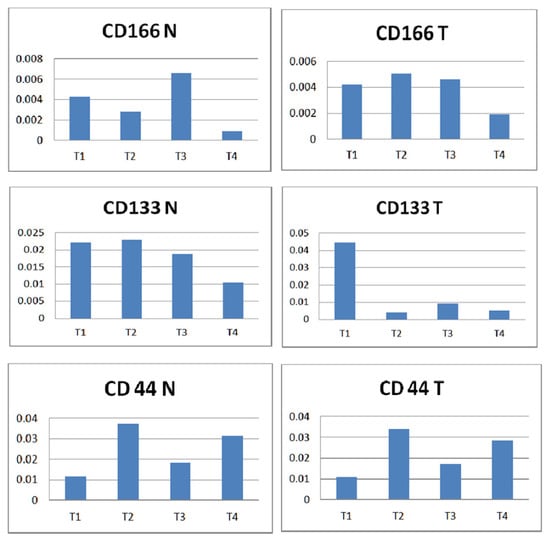 When comparing CD166 vs CD133 vs CD44 according to tumor staging (Figure 7), only one pattern of expression was observed in the case of CD166 and CD44 that reached the highest levels in tumor tissue at the T2 stage. A considerably high expression of CD133 was noted in tumor tissue at the T1 stage. When comparing normal vs tumor among each marker, a similarity was noted with the lowest level of CD44 expression at T1, highest at T2, and T4 was higher than T3. In the case of CD166, the lowest expression was registered at the T4 stage, in both normal and tumor tissue.