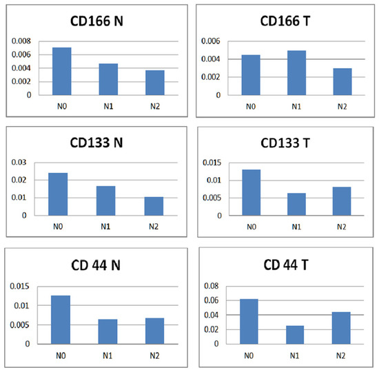 Regarding the expression of N0, N1 and N2 levels (Figure 8) when comparing normal versus tumor tissue among each marker only, no patterns or associations were observed when comparing the charts. When comparing CD166 vs CD133 vs CD44, the highest expression levels of all three markers were observed in the normal tissue (stage N0). Only one exception was noted, which was the expression of CD166 in tumor tissue, where the highest level was associated with the N1 stage. A similar pattern of expression of both CD133 and CD166 was noted in the normal tissue, with decreasing values from N0 to N1 to N2. Another similarity was noticed when comparing the expression of CD133 and CD44 in tumor tissue, with the highest levels related to the N0 stage, which decreased in the N1 stage and increased in the N2 stage.