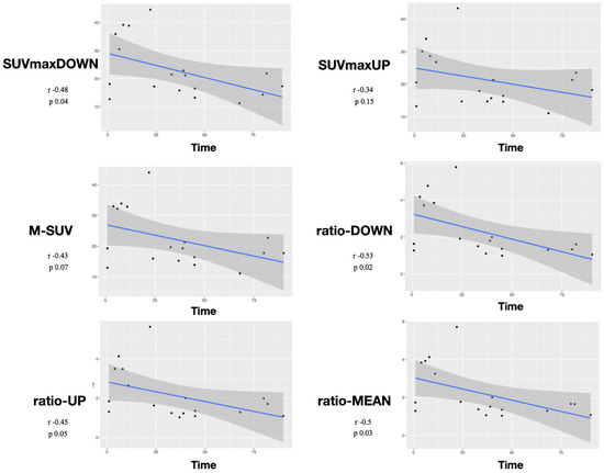 The mean value of the ratio-UP was 1.4 ± 1.1 and of the ratio-DOWN was 1.6 ± 1.3. Mean follow-up time was 22.2 months (min/max 13/32). (Table 1). Fusion was achieved and registered in all the cases at one-year follow-up. Considering Pearson correlation, the analysis showed a negative correlation between the variables SUVmaxDOWN/time (r = −0.48, p = 0.04), ratio-DOWN/time (r = −0.53, p = 0.02), and ratio-MEAN/time (r = −0.5, p = 0.03). The p was not significant for the variables SUVmaxUP/time (p = 0.15), M-SUV/time (p = 0.07), or ratio-UP/time (p = 0.058) (Figure 2).