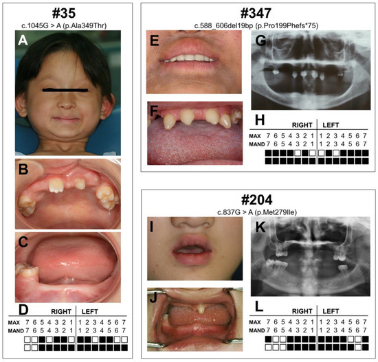 Clinical features of patients with X-linked hypohidrotic ectodermal dysplasia (XLHED). (A) Facial photographs of patient #35. (B,C) Intraoral photographs of patient #35. (D) Schematic of congenitally missing permanent teeth of patient #35. According to medical records, right maxillary first premolar, right maxillary second molar, left maxillary canine, and right mandibular second molar were in the jawbone and could be found by panoramic radiograph. (E) Perioral photographs of patient #347. The patient wore removable dentures. (F) Intraoral photographs of patient #347. (G,H) Panoramic radiograph and schematic of congenitally missing permanent teeth of patient #347. (I) Perioral photographs of patient #204. (J) Intraoral photographs of patient #204. (K,L) Panoramic radiograph and schematic of congenitally missing permanent teeth of patient #204. Solid squares indicate congenitally missing teeth. Max: indicates maxillary. Mand: mandibular.