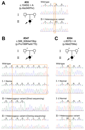 Sequencing chromatograms of three female patients with XLHED. (A) Sequencing chromatograms show a heterozygous missense variant (c.1045G>A, p.Ala349Thr) identified in patient #35. (B) Sequencing chromatograms show a heterozygous frameshift variant (c.588_606del19bp, p.Pro199Phefs*75) identified in patient #347. (C) Sequencing chromatograms show a heterozygous missense variant (c.837G>A, p.Met279Ile) identified in patient #204. Black arrows indicate the proband in each family. Solid circles and squares represent the individuals with HED. Asterisks indicates that DNA samples are available. Black circles represent the individuals with XLHED. Black arrows indicate the probands.