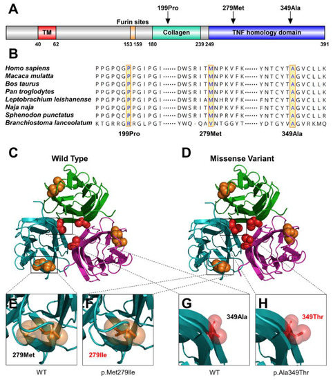 We conducted bioinformatics analyses to predict the functional effects of the three identified EDA variants. Based on the results of conservation analyses among multiple species, 199Pro was located in the highly conserved collagen domain, and 279Met and 349Ala were located in the highly conserved TNF homology domain (Figure 3A,B).