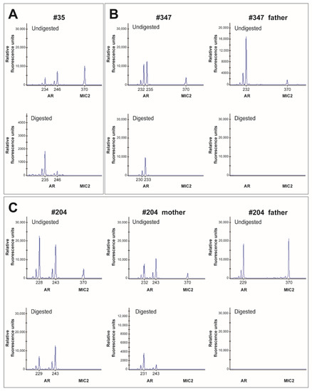 Skew of the X-chromosome inactivation (XCI) analysis. (A) The capillary electrophoresis results of patient #35. (B) The capillary electrophoresis results of patient #347 and her father. (C) The capillary electrophoresis results of patient #204 and her parents.