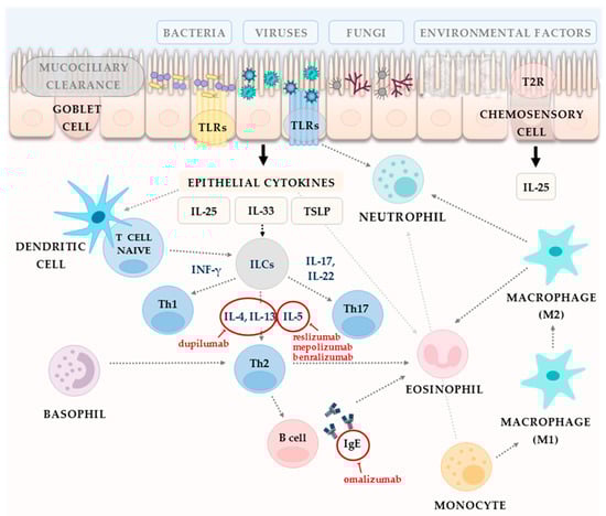 General immune mechanism involved in the pathogenesis of CRS and targets for selected biologics. Immune response combines the airway epithelium response as a first line of defence in sinuses that meet environmental factors with innate immune activity which leads to adaptive immune activation ([2,13], modified).