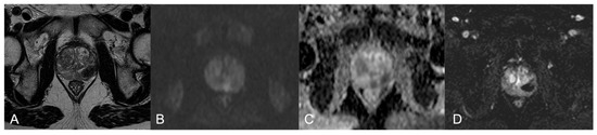 The MRI PI-RADS v2.1 acquisition protocol included high-resolution T2w sequences in the axial (TR/TE = 4790/123 ms, voxel size = 0.3 × 0.3 × 3.0 mm3), sagittal (TR/TE = 4470/101 ms, voxel size = 0.3 × 0.3 × 3.0 mm3) and coronal (TR/TE = 3520/123 ms, voxel size = 0.3 × 0.3 × 3.0 mm3) planes, automatically interpolated from a voxel size of 0.74 × 0.63 × 3.00 mm3 by the MRI console; a T1-weighted sequence (TR/TE = 450/10 ms, voxel size = 0.6 × 0.6 × 3.0 mm3) in the axial plane; a multi-b DWI (b-values = [50, 100, 800, 1000] s/mm2, voxel size = 1.0 × 1.0 × 3.0 mm3, three directions) EPI sequence, automatically interpolated from a voxel size of 2.60 × 2.08 × 3.00 mm3 by the MRI console, whose corresponding ADC maps were automatically calculated using software on board of the MRI console; a high-b DWI (b-values: [1400, 1800] s/mm2, voxel size = 2.2 × 2.2 × 3.0 mm3, three directions) EPI sequence; a Dynamic Contrast Enhancement (DCE) assessment with time intensity curves evaluation, as previously described [8].
