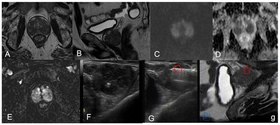 Non-specific GP in a 70-year-old patient (case 3). The mpMRI shows diffuse and inhomogeneous hypointensity on T2w axial (A) and sagittal (B) images with loss of peripheral/transition zone differentiation, markedly restricted diffusivity at high b-value (C) and corresponding marked low ADC value (D), inhomogeneous hyperenhancement at DCE (E). PIRADS v2.1 score 4 PZ diffuse. At transrectal US (F), preliminar to the fhTFTB, we can see multiple confluent hypoechoic areas both in the peripheral and transition zone. The free-hand transperineal fusion MRI/US-targeted biopsy (G,g): on the US image in (G) we can appreciate the needle entering into the target in red, in (g) we have the corresponding MRI-guidance image with the same target in red.