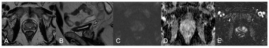 The mpMRI ((A): axial T2w image; (B): sagittal T2w image; (C): high b-value DWI; (D): ADC map; (E): DCE image) performed 1 year later shows the almost complete resolution of the findings mentioned in Figure 2 and in the text (case 3).