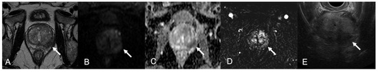 Case Five: A 67-year-old patient with irritative symptoms (frequency and urgency), enlargement and induration of the prostate at DRE, PSA 11.4 ng/mL PSA density 0.09 ng/mL/cc. mpMRI (Figure 4) showed a 2.8-cm hypointense lesion of the left prostate base (arrow in Figure 4A), hyperintense in DWI (arrow in Figure 4B), with markedly low ADC value (arrow in Figure 4C) and an early and prolonged enhancement with high peak (arrow in Figure 4D). The PIRADS v2.1 score assigned was five. The patient also had a transition lesion on the prostate apex, not shown in Figure 4, characterized by a blurred low signal in T2w images, hyperintensity in DWI and corresponding marked low ADC value and early and prolonged enhancement with high peak too. The PIRADS v2.1 score assigned to the TZ lesion was five. At the transrectal US performed prior to the biopsy, we can see a wide hypoechoic peripheral area, which corresponds to the mpMRI PZ findings (arrow in Figure 4E). The histopathological analysis on the biopsy specimen showed NGP.