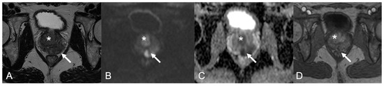 BCG-GP in a 52-year-old patient (case 6). In the T2w image, we can see a lesion in the transition zone (star in (A)) and an extended peripheral alteration involving the left prostate lobe at the middle/base level (arrow in (A)) with capsular bulging. In DWI, there is a median area characterized by a markedly restricted diffusivity (arrow in (B)); also, the transition lesion is hyperintense in DWI (star in (B)). The 2 findings (star and arrow in C) have low ADC value, especially the peripheral one (arrow in (C)). In DCE image, the peripheral lesion has a thick peripheral rim enhancement with an avascular core due to caseous necrosis (arrow in (D)), whereas the transition lesion has an early and prolonged hyperenhancement (star in (D)), due to the absence of central caseous necrosis. PIRADS v2.1 5 PZpm mid-base left (arrows) and 5 Tza mid-base right (stars).