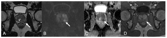 Although some lesions, particularly those induced by BCG, may show a decrease in size and even a return to the normal appearance of the prostate gland with no detectable residual cavity on repeat mpMRI after one year of anti-tuberculosis treatment [10,21], in our study all patients underwent transperineal prostate biopsy. This choice is due, nowadays, to the lack of certain and definite imaging findings and to the need to rule out concomitant prostate cancer. Studies on larger series or, maybe, the use of artificial intelligence methods [8] such as radiomic features [22] and, in particular, deep learning methods, could help the radiologist to unravel this challenging differential diagnosis.