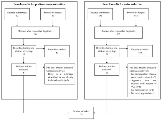 A literature review was conducted using the search engines PubMed and Scopus. Different queries were created for the positron range correction techniques and denoising approaches. For the positron range correction, we created queries incorporating terms related to PET, 68Ga, and positron range, while for noise reduction, terms such as PET, 68Ga, noise, or low count were used. The queries of the positron range corrections techniques are presented in Table A1 and Table A2 in Appendix A for PubMed and Scopus, respectively. Table A3 and Table A4 in Appendix A describe the queries that were used to retrieve articles related to noise reduction from PubMed and Scopus, respectively. As we aim to provide an overview of recent literature, only articles published between January 2010 and 1 August 2022 were included. From the retrieved records, duplicates were removed, then title and abstract screening was performed. Lastly, full-text screening was performed. In Figure 1, the chart of the screening process is illustrated.