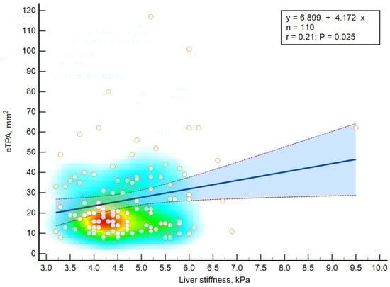 An increase in the liver stiffness value by 1 kPa was associated with an increase in cTPA by 4.17 mm2 (p = 0.025). Additionally, patients with liver stiffness values corresponding to the fourth quartile (>5.20 kPa) had significantly higher (p = 0.032) maximal carotid stenosis values—25.0% (0.00; 32.2) versus 22.5% (0.00; 28.0).