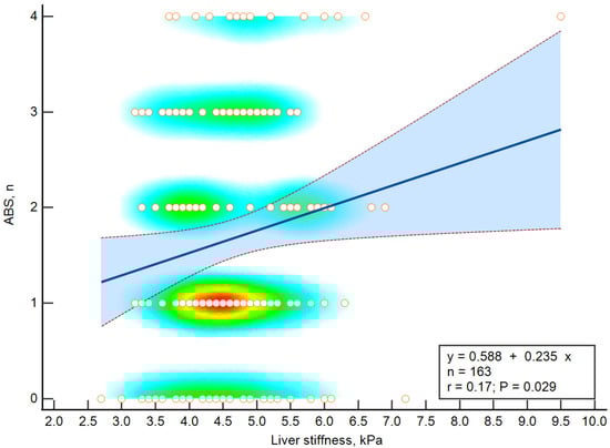 Significant relationships were established between liver stiffness and ABS based on the results of linear regression analysis (see Figure 3). Table 1 shows the distribution of patients by ABS score.