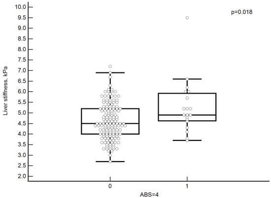 Patients with generalized atherosclerosis (ABS = 4) had statistically significantly higher liver stiffness values (see Figure 4).