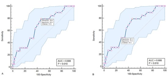 ROC curves demonstrating the diagnostic value of liver stiffness in relation to generalized atherosclerosis. Sub-figures (A,B) show the selected cut-off points that provide optimal values of sensitivity (A) and specificity (B).