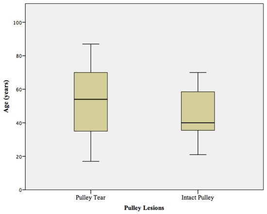 Mean age of patients with acute lesions of the biceps pulley (mean age 52 ± 12 years) compared to patients with intact biceps pulley (mean age 44 ± 14 years, p = 0.023). The mean age of patients with acute pulley lesions was significantly higher compared to patients without pulley lesions (p = 0.023).