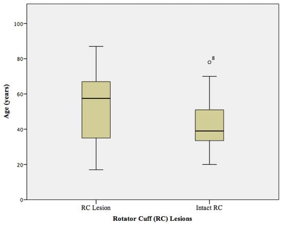 Mean age of patients who showed a lesion of the rotator cuff which was 54 ± 19 years and was not significantly higher compared to the patients without a lesion of the rotator cuff (mean age 43 ± 17 years, p = 0.29).