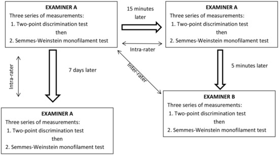 - Bulut, T.; Tahta, M.; Sener, U.; Sener, M. Inter- and intra-tester reliability of sensibility testing in healthy individuals. J. Plast. Surg. Hand Surg. 2018, 52, 189–192. [Google Scholar] [CrossRef] [PubMed]