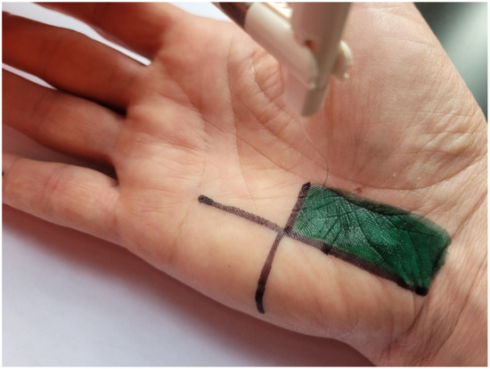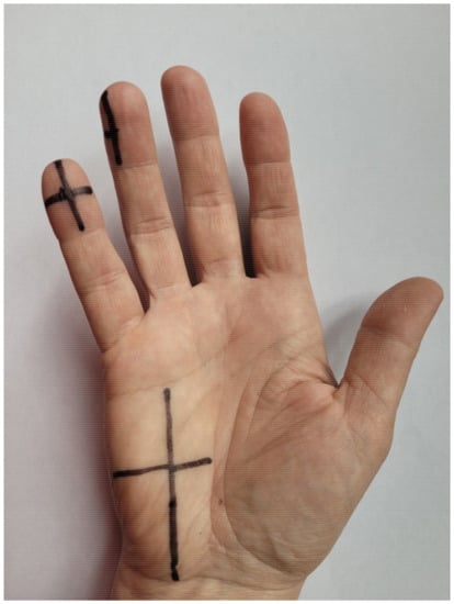 The TOUCH TEST device (North Coast Medical, Inc., Morgan Hill, CA, USA) was used for the SWM test. The device consists of five monofilaments calibrated to produce a specific force in grams: green (size 2.83), 0.07 g; blue (size 3.61), 0.4g; purple (size 4.31), 2.0 g; pink (size 4.56), 4.0 g; and red (size 6.65), 300 g. The monofilament was applied perpendicularly to the measurement location so that a slight deflection occurred. Pressure was maintained from 1 to 3 s. The test began with the thinnest monofilament by randomly touching the crossing point of the previously marked lines on the hypothenar eminence, and the fourth and fifth digits (Figure 4). The subject’s task was to verbally indicate the location of stimulation, i.e., hypothenar eminence, fourth digit, or fifth digit. The thinnest monofilament of three measurements that the subject indicated during stimulation was recorded, and this value was used in the analysis [14,25] in which the following scale was adopted: 0—no sensation during stimulation; 1—0.07 g monofilament; 2—0.4 g monofilament; 3—2.0 g monofilament; 4—4.0 g monofilament; and 5—300 g monofilament [20]. The scale was used in order to calculate the kappa statistic.