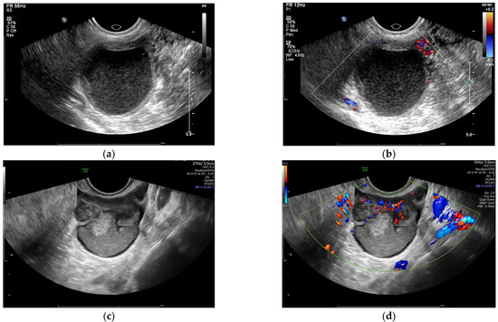 All patients underwent preoperative ultrasonography using Voluson E10 (GE Healthcare, Chicago, IL, USA), EIPQ5, and iU22 (Philips Healthcare, Manchester, UK) ultrasound machines with 5.0–9.0 MHz and 4.0–8.0 MHz transvaginal probes and 1.0–5.0 MHz transabdominal probes. Ultrasound parameters were adjusted to optimize the image quality for each patient. Traditionally, a routine pelvic ultrasound evaluates the uterus and ovaries, which leads to the detection of primary lesions [12]. Otherwise, as suggested by the International Deep Endometriosis Analysis (IDEA) consensus [13], endometriosis nodules in the anterior and posterior pelvic compartments are assessed. Multidimensional and multiangle real-time scans were performed. The location, size, shape, echogenic characteristics, and relationship with surrounding organs of the tumor were recorded. Color Doppler flow imaging within each tumor was also recorded and was graded according to the standard established by D. Timmerman et al. [14], i.e., no color flow signal, only minimal color signals, moderate color signals, or abundant color signals detected. When multiple adnexal masses were detected, we analyzed the mass with the most complex ultrasonographic morphology, and when masses had similar morphological characteristics, we chose the largest mass [15] (Figure 1).