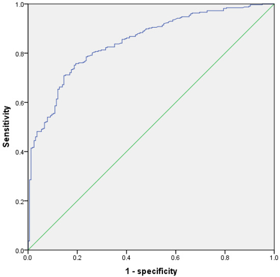 Furthermore, we set preoperative parameters with statistical differences between groups A and B as logistic regression covariates, i.e., we removed three intraoperative or pathological parameters. The results demonstrated that eight indicators including age ≥ 40 yrs, bilateral endometrial cysts diagnosed by ultrasound, pelvic endometriosis nodules diagnosed by ultrasound, adenomyosis diagnosed by ultrasound, APTT, CA125 ≥ 34.5 U/mL, D-dimer ≥ 0.34 mg/L, and maximum cyst diameter ≥ 58 mm were independent related factors of severe endometriosis (Table 6). ROC analysis according to the predicted value of logistic regression showed that the AUC = 0.846 (95% CI: 0.811~0.880, p < 0.001) (Figure 2), the diagnostic efficiency of which was equivalent to the previous model including intraoperative parameters.