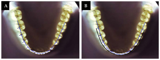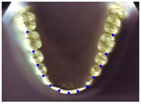 The determination of arch forms from the pre-treatment mandibular arch has been common [4,6,8,9,10,11,12,13] as there are more therapeutic limitations in the mandibular dental arch than in the maxillary arch, and maintaining the mandibular intercanine width is essential for stable orthodontic treatments [14,15]; thus, investigating arch dimensions becomes necessary [16]. Many authors have described the arch form using geometric shapes and mathematical formulas [17,18]. Others used landmarks such as incisal edges and cusp tips to characterize an individual patient’s arch form [16,19,20,21,22,23]. These approaches may not be adequately precise because archwires are placed on the slot point of the brackets, which are located on the facial axis points. Therefore, recent research has used clinical bracket points for arch form analysis, which seems more clinically relevant [4,6,9,11,12,13].