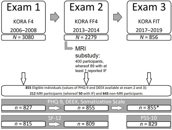 Schematic Study Design, Sample and Endpoint Assessment. Of 3080 individuals from exam 1, only 856 participated in exam 3. Of these, 855 could be included in the main analysis. The Patient Health Questionnaire (PHQ-9), the Depression and Exhaustion Scale (DEEX) and the Somatization Scale were available at all three exams. The Short-Form-Health-Survey-12 (SF-12) was applied at exams 1 and 2, and the Perceived Stress Scale (PSS-10) at exam 3. * denotes n = 854 for Somatization Scale at exam 3.