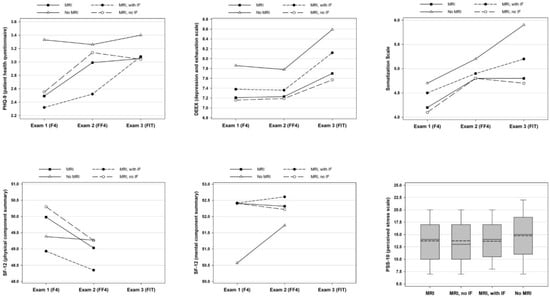 Psychosocial Outcomes of the Study Population according to Participation in Whole-body MRI (MRI) and Presence of Incidental Findings (IF). For PHQ-9, DEEX, SF-12 and the Somatization Scale, arithmetic mean is shown for the four subgroups and three exams. SF-12 was merely applied in exams 1 and 2. Outcomes of PSS-10 obtained in exam 3 are presented as boxplots with arithmetic mean (dashed line) and median (continuous line). Figure 2 shows unadjusted, descriptive data.