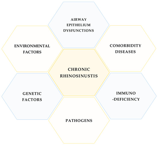 Chronic rhinosinusitis (CRS) is a heterogeneous group of sinus diseases with unclear molecular bases, although some factors are associated with the disease: bacterial, fungal and viral infections, comorbidity diseases, genetic dysfunctions, and immunodeficiency (Figure 1).