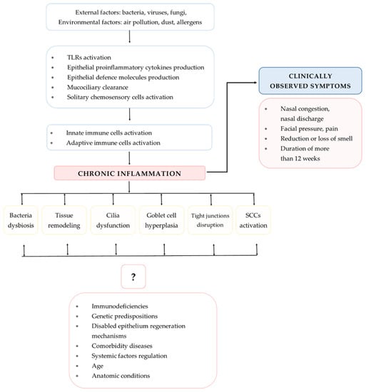 Mechanisms involved in CRS pathogenesis (TLRs—Toll-like receptors; SCCs—solitary chemosensory cells).