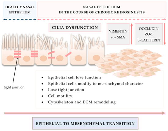 During EMT, epithelial cells lose their functions and acquire the character of mesenchymal cells. Cells lose TJs, gain motility function, remodel cytoskeleton and ECM, and have altered gene and protein expression [133]. The TGFβ pathway is among the best known factors involved in the process of EMT. In eosinophilic and non-eosinophilic CRSwNP, miR-182 regulated EMT in response to TGFβ1 and might promote nasal polypogenesis [134]. The role of TGFβ1 is significantly more pronounced in CRSsNP than in the case of CRSwNP. In CRSsNP, TGFβ1 activates heat shock protein 47 (HSP47) that is overexpressed in the nasal fibroblasts and it leads to myofibroblast differentiation as well as ECM production. TGFβ1 induces HSP47 expression via the Smad 2/3 pathway. Interestingly, glucocorticosteroids were able to decline effects of HSP47 induction by TGFβ1 [135]. Additionally, the TGFβ/Smad 2/3 pathway leads to collagen and connective tissue growth factor (CTGF) production in fibroblasts obtained from CRSsNP mucosa [136]. The expression of relaxin-2, Smad2, Smad3 and TGFβ1 mRNA in the CRSsNP group was significantly higher than in the CRSwNP and control groups [137]. Moreover, miR-21 might be involved in EMT through the activation of the TGFβ1-mediated PTEN/Akt pathway [138].