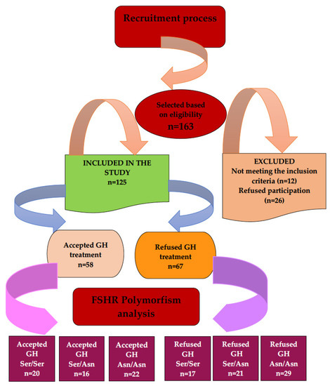 Women were informed about the possible benefits of GH administration and the study protocol before enrollment. Informed consent was obtained from all patients participating in the study, prior to their participation. A total of 125 women were enrolled in the study and divided into two groups: group A (58 patients), in whom GH treatment was added to the conventional treatment, and group B (67 patients), who refused the addition of GH to the conventional treatment (Scheme 1). Data on the medical history of each participant were collected at the time of enrollment into the study.