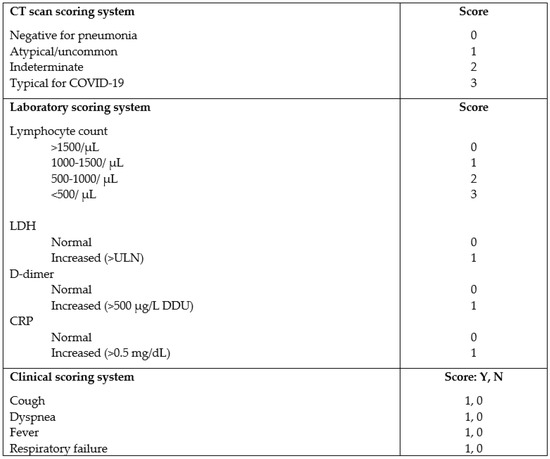 CT scan, laboratory and clinical scoring system. LDH=lactate dehydrogenase, CRP= C reactive protein, ULN= upper limit of normality, DDU = D-dimer unit, Y = yes, N = no.