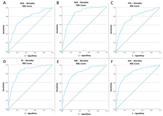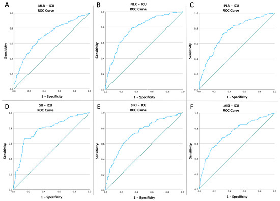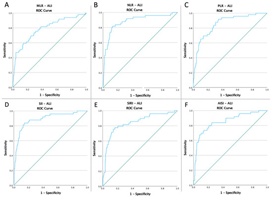 SPSS for Mac OS version 28.0.1.0 was used for the statistical analysis (SPSS, Inc., Chicago, IL, USA), and Chi-square tests were employed to analyze the associations of MLR, NLR, PLR, SII, SIRI, and AISI with the category factors, while Student’s t and Mann–Whitney tests were used to assess differences in continuous variables. The receiver operating characteristic (ROC) was used to assess the predictive power and to establish the cut-off values of MLR, NLR, PLR, SII, SIRI, and AISI, based on the Youden index (Youden Index = Sensitivity + Specificity − 1, ranging from 0 to 1). To identify independent predictors of ALI development, ICU admission, and mortality, a multivariate logistic regression analysis using variables with p < 0.1 was undertaken.