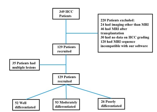This was a monocentric, retrospective study compliant with Health Insurance Portability and Accountability Act (HIPAA) policies. Informed patient consent was waived by our Institutional Review Board (IRB). Inclusion criteria are shown in Figure 1. A total of 129 HCC patients with baseline MRI and pathologic report were identified between January 2003 and June 2017. All lesions were hypervascular on hepatic arterial phase imaging, with washout on portal venous/delayed phases and rim enhancement.